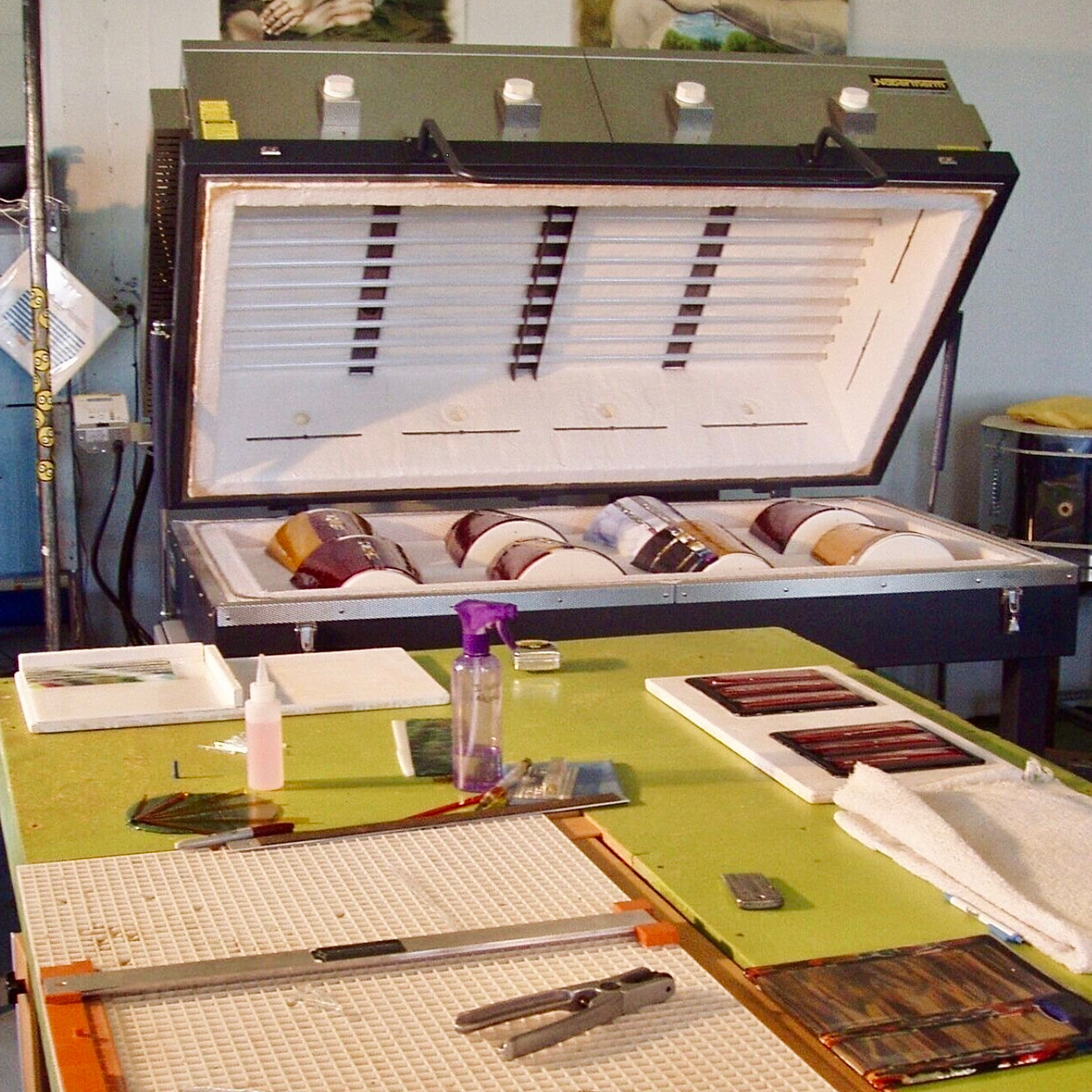 Individuals interested in utilizing our cold working tools, such as a tile saw, lapidary grinder, sandblaster, drill press, and more, have the opportunity to rent them at a rate of $35 per hour. Prior experience with the tools is necessary for rental, or, alternatively, you can arrange a private session with us to become acquainted with their operation.